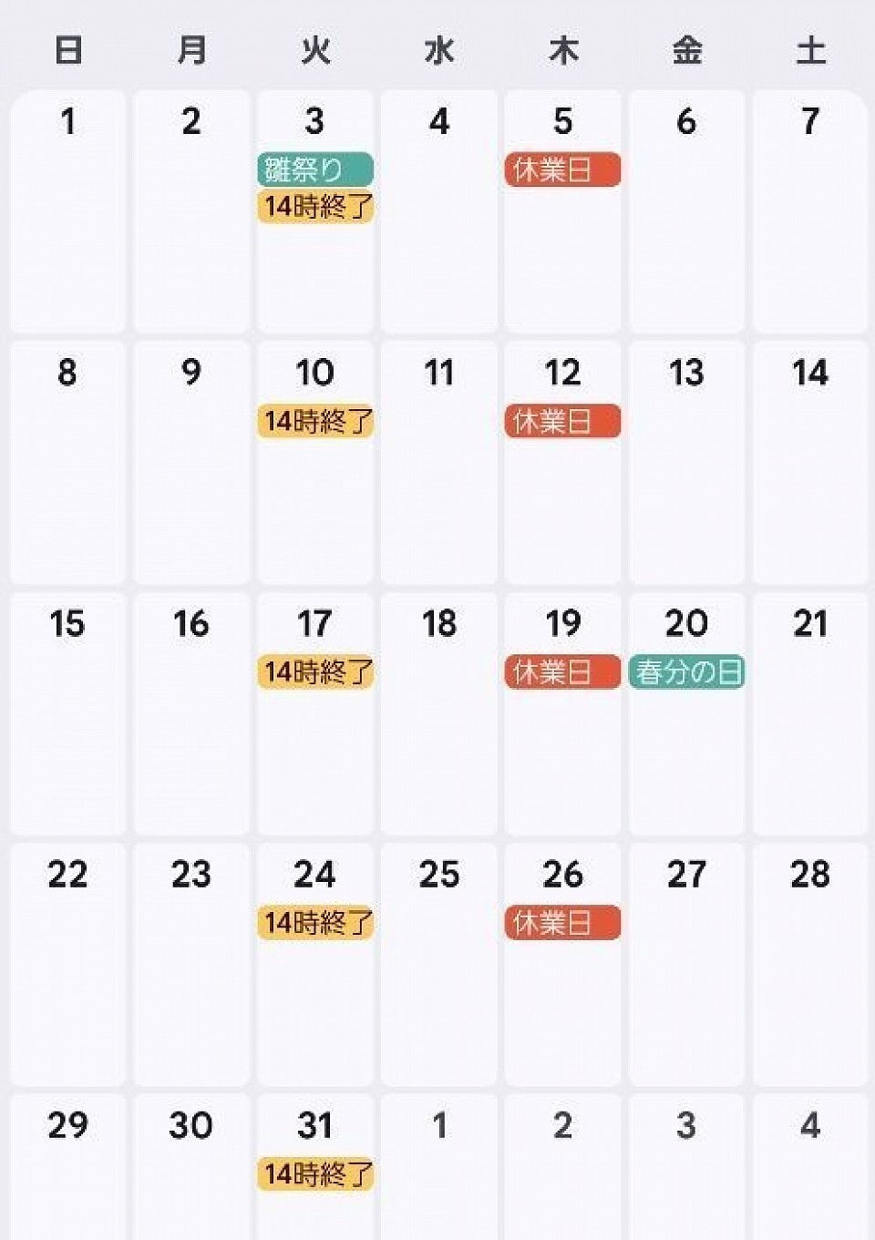 🎌毎週火水定休日(3月から毎週月火水定休)
